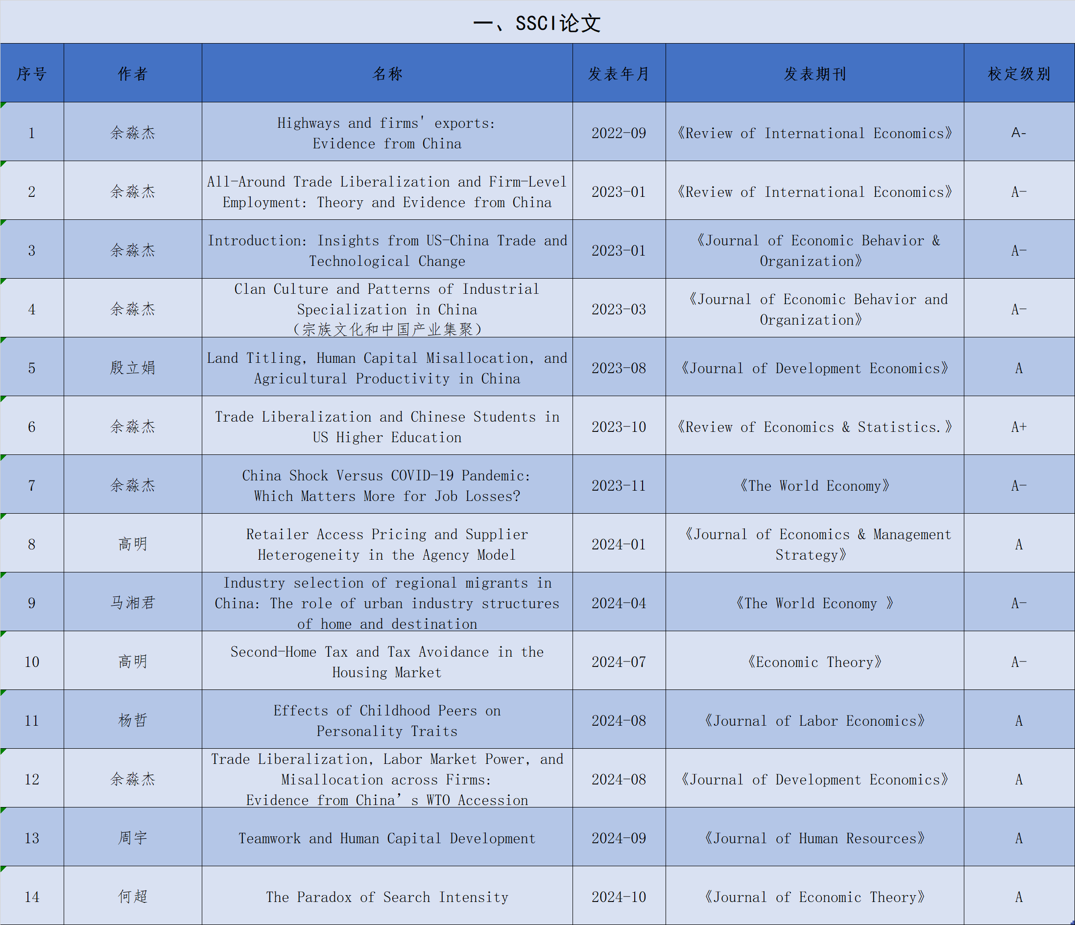 研究院成立伊始便对标世界一流学术前沿,鼓励教师用国际学术语言讲述中国故事,创新理论体系。教师们有着扎实的前期积累,经过入职以来的酝酿沉淀,相继在各自研究领域的国际顶级期刊上发表文章。据统计,截至目前,经济学部教师近两年在经济学7本国际顶级期刊Review of Economics and Statistics,Journal of Development Economics, Journal of Public Economics, Journal of Economics & Management Strategy, Journal of Labor Economics, Journal of Economic Theory, Journal of Human Resources上共发表文章8篇,其中7篇来自中国经济研究院引进的中青年人才。此外,他们还在《管理世界》《经济学(季刊)》等顶级中文期刊发表论文4篇,《中国工业经济》《数量经济技术经济研究》等一流中文期刊发表论文4篇。研究院教师为学校“双一流”建设贡献了一个又一个标志性成果!