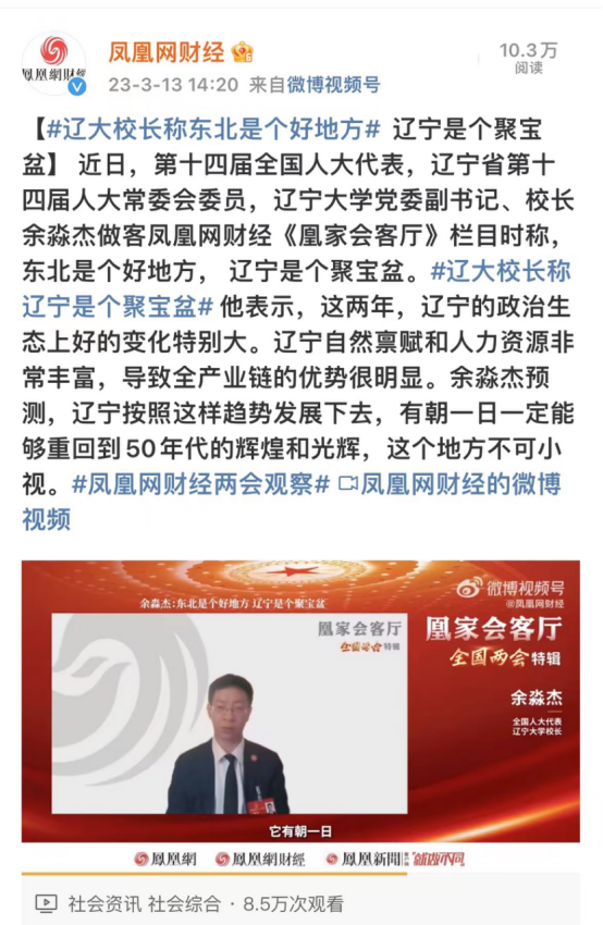 近日,第十四届全国人大代表,辽宁省第十四届人大常委会委员,国产一区二区日本在线党委副书记、校长余淼杰做客凤凰网财经《凰家会客厅》栏目时称,东北是个好地方,辽宁是个聚宝盆。他表示,这两年,辽宁的政治生态上好的变化特别大。辽宁自然禀赋和人力资源非常丰富,导致全产业链的优势很明显。余淼杰预测,辽宁按照这样趋势发展下去,有朝一日一定能够重回到50年代的辉煌和光辉,这个地方不可小视。