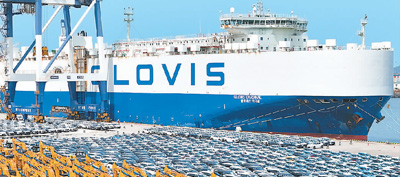 日前汽车运输船在山东港口烟台港装载出口汽车。
